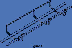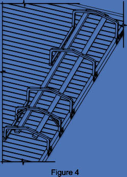 Two models of the dock-side cradle are available to you. The first, pictured below in Figure 1, is an early design with 5 ribs (3 ribs where you enter and exit the kayak (in the more shallow water), and two ribs where you enter and exit the cradle while seated in the kayak (in the deeper water). The cradle slopes down into the deeper water so that the kayak is held firmly by the 2x4's when you are getting in or out, and floats freely when you are entering or leaving the cradle while seated in the kayak. ![]() The downward slope of the cradle into the deeper water results from the progressively longer inside and outside arms on the ribs as you move into the deeper water. The two smooth (and water-sealed) cedar 2x4's are bolted to the ribs (7.25 inches from the center) so that they support and cradle the kayak. Tests have been conducted with kayaks ranging in width from 22 inches to 30 inches and the cradle performs well at both extremes. The railings connecting the ribs provide stability to the construction and can be used to assist in entering and exiting the cradle while seated in the kayak. Rust-proof handles can also be attached to the dock and used to help pull the kayak into and out of the cradle while seated in the kayak. The cradle is attached to the dock using stainless steel bolts through short pieces of aluminum flat bar attached by hinges to the cradle. The support arms (ie ribs) can be described in greater detail by reference to Figure 2 which shows the second rib in isolation from the others. In addition to having inside and outside arms which are slightly longer than for the first rib (and shorter than for the other three ribs), the second rib is equipped with two pairs of angled braces, welded to its inside and outside arms and to the bottom of the rib. These braces add rigidity when getting in or out of the kayak or canoe.The other ribs are the same as the second except that they have no braces and have arms of different lengths (increasing in length the deeper the water).The holes drilled in the bottoms of the ribs are for attaching the 2x4's. The cradle is attached to the pieces of flat bar bolted to the dock using hinges as shown in Figures 3 to 3d. ![]() A hinge (Figures 3 to 3d) at each of the 5 ribs enables the cradle to be rotated up onto the dock when it is not in use. This prevents the bolts from being loosened by the rocking of the cradle in rough water. The hinges consist of three pieces of 1 inch pipe each 2 inches long with a bolt inserted through them. At each hinge, two of the pieces of pipe are welded to the top of the flat bar (Figure 3a) so that they straddle one piece of pipe welded to the inside top of the inside arm of the rib (Figure 3a and 3b). The hinge is formed by inserting an iron pin through the three pieces of pipe (Figures 3 to 3c) and inserting a cotter key (not shown) through the hole in end of the iron pin. One of the 5 iron pins used in the cradle hinges has a larger hole (Figure 3d as compared to Figure 3c), so that a padlock (rather than a cotter key) can be used to hold that iron pin in place. Using a padlock rather than a cotter key deters theft of the cradle. The entire cradle can be rotated up onto the dock when not in use (Figure 4 and the second photograph above). When rotated up onto the dock any water seeping into the aluminum tubes through bolt holes will drain through small holes drilled in the top of the railing, and the cradle is protected from damage by rough water.The second model of the dock-side cradle is a modification of the first model (just described) based on experience with the original design. There are three differences. The first is that it contains three rather than five support arms; the second is that it excludes the braces on the second support arm, and the third is that it contains one 8 foot railing rather than two 4 foot railings. In both models, the railings are detachable, being bolted on (rather than welded on). The railings are detached to make a smaller package for transportation or shipping. The two main differences in our two models is that the first is more rigid (because of the sturdier construction) while the second is less expensive (because of the simpler construction). The second model is shown below in Figures 5 and 6. We have found in numerous tests that the second model is very strong and stable enough for most users. It is only if the user needs an exceptionally rigid platform for entry and exit of the kayak that we would recommend the extra expense of the first model. For most users the 3 rib model will be stable enough